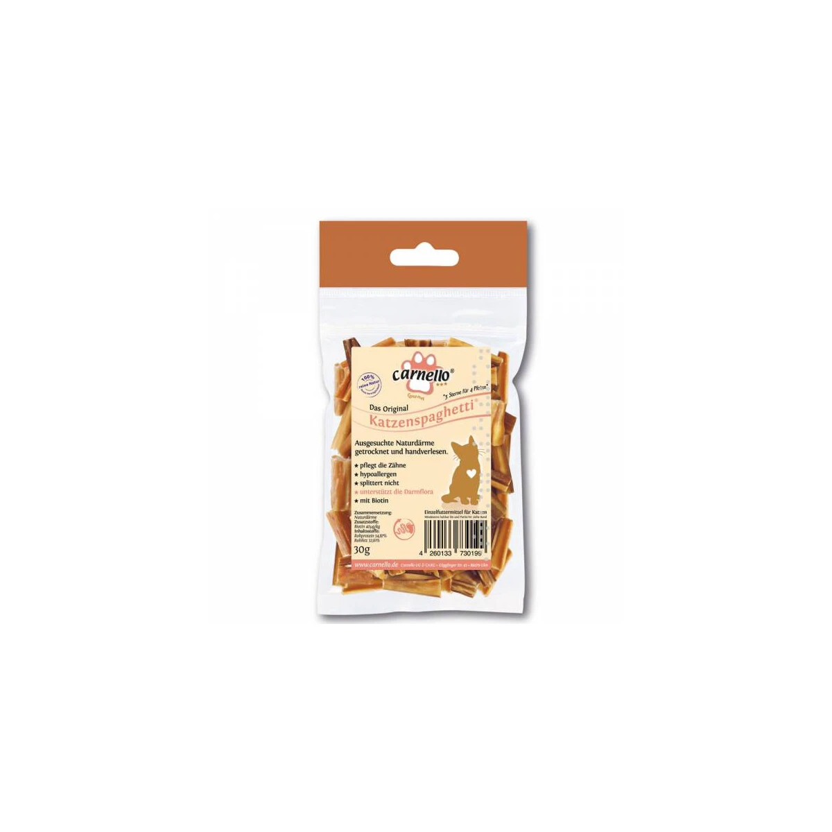 Aufgrund vieler Nachfragen von Katzenbesitzern haben wir uns entschlossen von unseren Hundespaghetti eine Version speziell für Katzen anzubieten. Denn auch Samtpfötchen lieben den besonderen Geschmack der kleinen Häppchen, der Dank der wiederverschließbaren Packung frisch bleibt wie am ersten Tag.