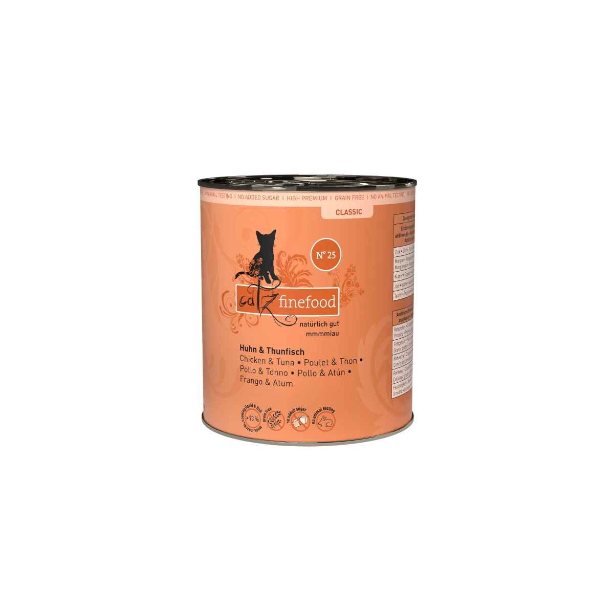 Feinkost für Katzen zur artgerechten Ernährung unserer Samtpfoten. Catz finefood No.25 enthält viel delikates Huhn, thunfisch und gesunde Zutaten wie Hagebutte und Kamille. Garantiert ohne Konservierungsstoffe, ohne Geschmacksverstärkern und ohne Farbstoffe. Gentechnikfrei. Mmmmiau!
