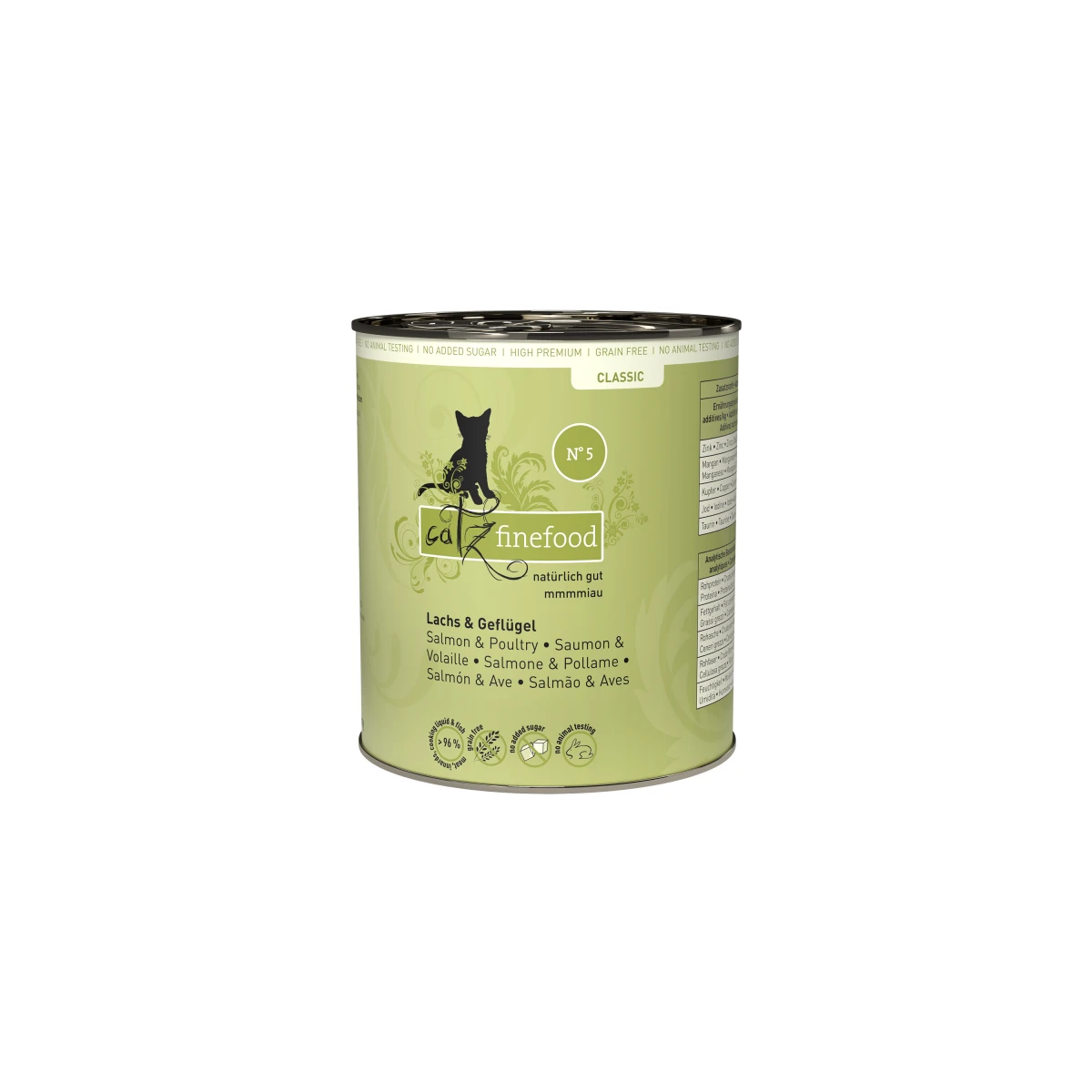 Feinkost für Katzen zur artgerechten Ernährung unserer Samtpfoten. Catz finefood No.5 enthält viel delikaten Lachs, zartes Geflügel und gesunde Zutaten wie Spinat und Tomate. Garantiert ohne Konservierungsstoffe, ohne Geschmacksverstärker und ohne Farbstoffe. Gentechnikfrei. Mmmmiau!