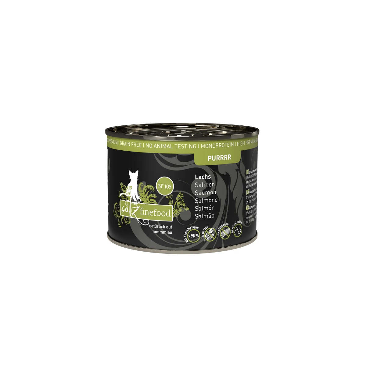 Monoprotein-Feinkost für Katzen zur artgerechten Ernährung unserer Samtpfoten. Catz finefood Purrrr No. 105 enthält leckeren und allergenarmen Lachs, die Kochbrühe, Mineralstoffe und Hanföl – mehr nicht. Damit ist es ein sehr hochwertiges Katzennassfutter, dass nicht nur super schmeckt, sondern auch für ernährungssensible oder mit Futtermittelunverträglichkeiten geplagte Katzen bestens geeignet ist. In der Kürze der Zutatenliste liegt die Qualität! Garantiert ohne Konservierungsstoffe, ohne Geschmacksverstärker und ohne Farbstoffe. Gentechnikfrei. Mmmmiau!