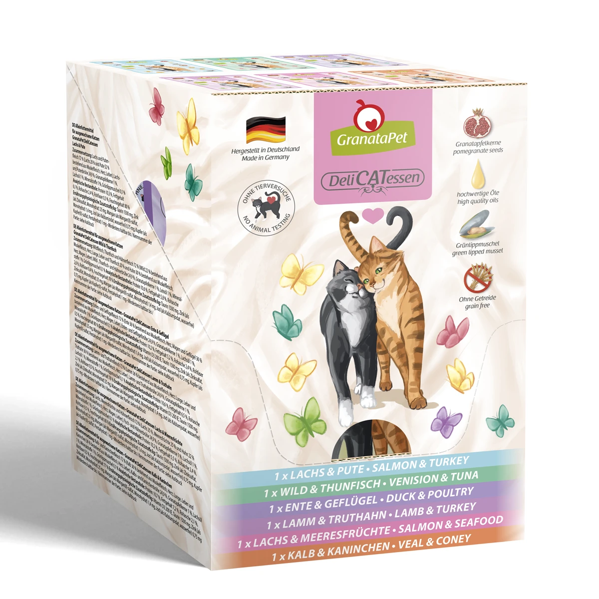 GranataPet wird aus feinsten und frischen Zutaten in Deutschland hergestellt. Die enthaltenen Granatapfelkerne sollen als Zellschutz und zur Stärkung des Immunsystems Ihrer Katze beitragen. Dieses erstklassige und außergewöhnliche Nassfutter kommt ganz ohne Getreide aus, ist glutenfrei und somit vorbeugend hypoallergen.