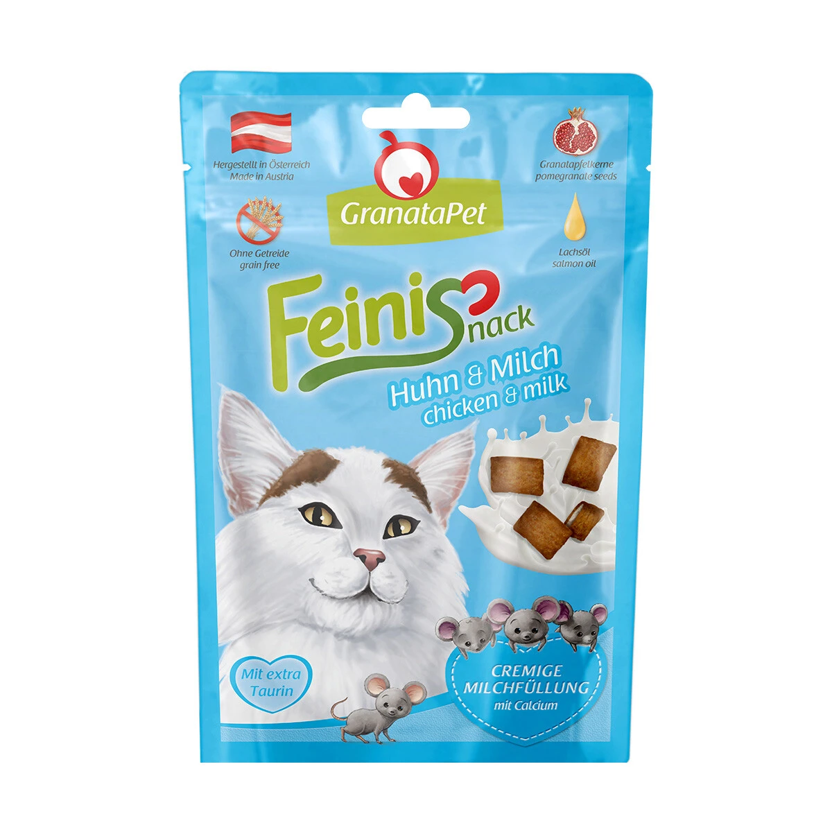 GranataPet Feinis Huhn & Milch sind mit ihrer wohl einzigartigen Komposition der ideale Snack für zwischendurch. Getreidefrei mit feinstem Hühnerfleisch, Lachsöl und Granatapfelkernen erobern unsere Feinis alle Katzenherzen.