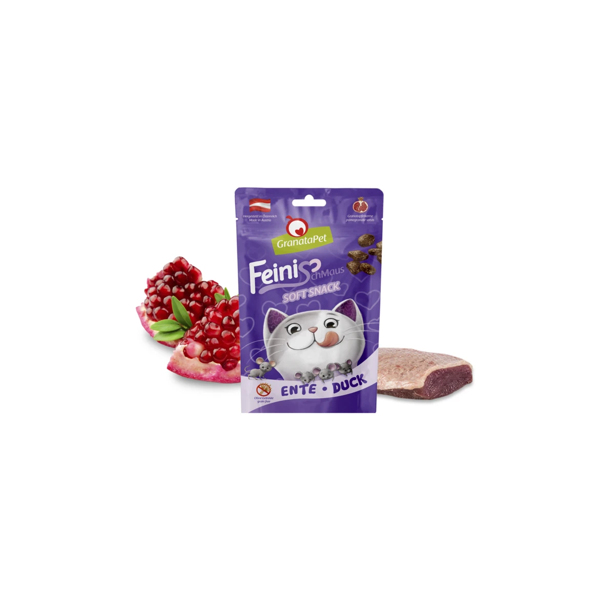 Fleisch und tierische Nebenerzeugnisse 90 % (Entenfleisch 26 % ), Granatapfelkerne 4 %, Hefe, Mineralstoffe