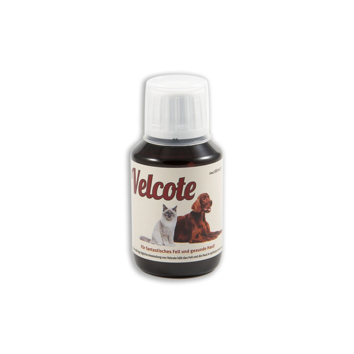 Velcote besteht aus drei rein natürlichen, schonend verarbeiteten Ölen – Weizenkeim, Leinsamen- und afrikanischem Nussöl. Diese Mischung gewährleistet das benötigte Fettsäure-Muster, so dass der Körper bereits mit minimalen Mengen gut versorgt ist. Die Zellen, die Haut und Haare bilden, können dadurch optimal nachgebildet werden. Bereits nach wenigen Tagen kann man sehen UND fühlen, wie sich die Fellstruktur verändert. Außerdem verschwinden Schuppen und kleine Ekzeme verheilen rasch.