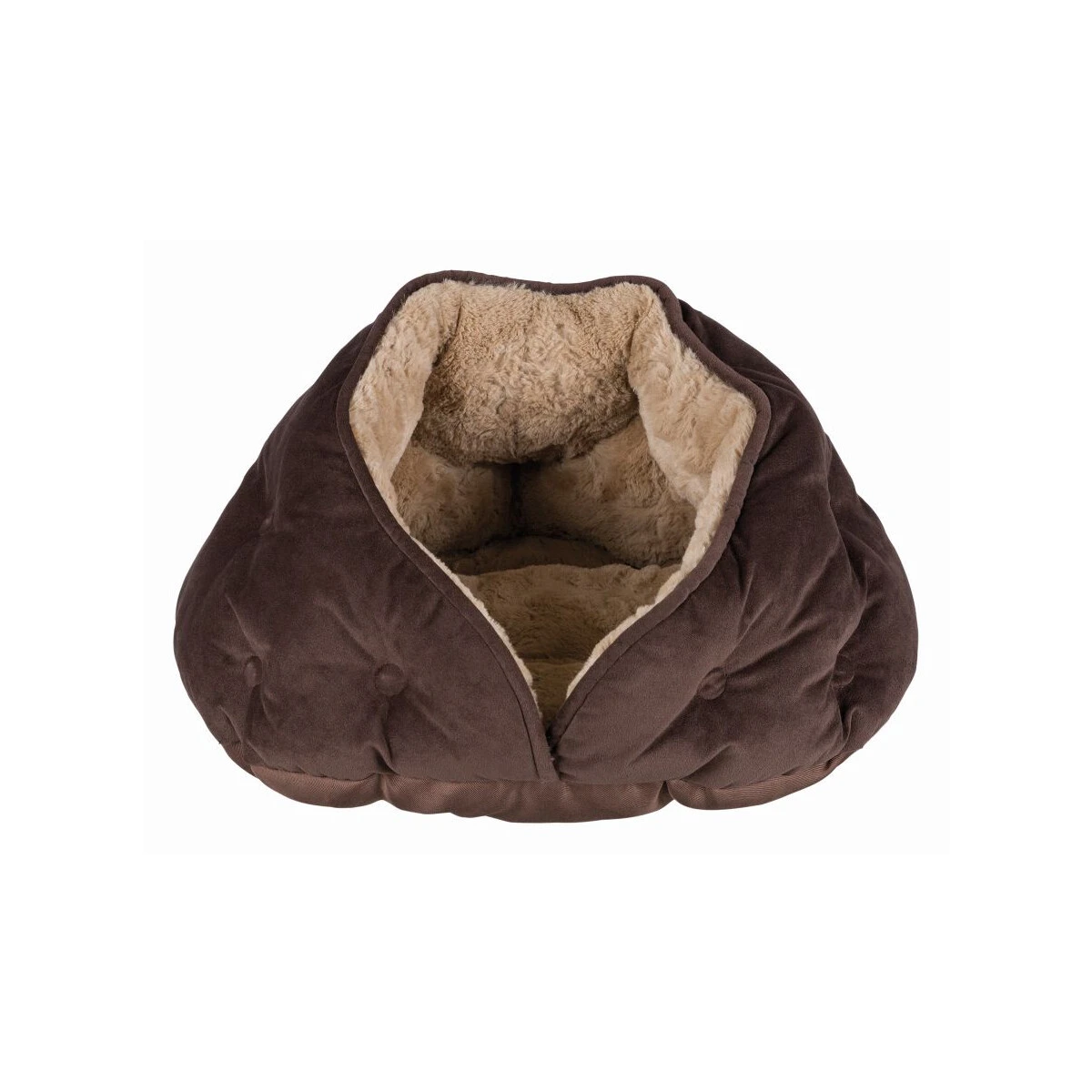 Eine wunderschöne Kuschelhöhle in Velouroptik, ausgekleidet mit kuscheligwarmen Softplüsch. Durch die etwas „andere“ Gestaltung der Öffnung kann sich hier die Fellnase wunderbar darin verkriechen und einmümmeln.