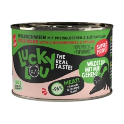 Langweiligen Einheitsfraß gibt’s woanders – Lucky Lou SuperMono² ist in 6 verschiedenen Sorten in 200 g-Dosen erhältlich.