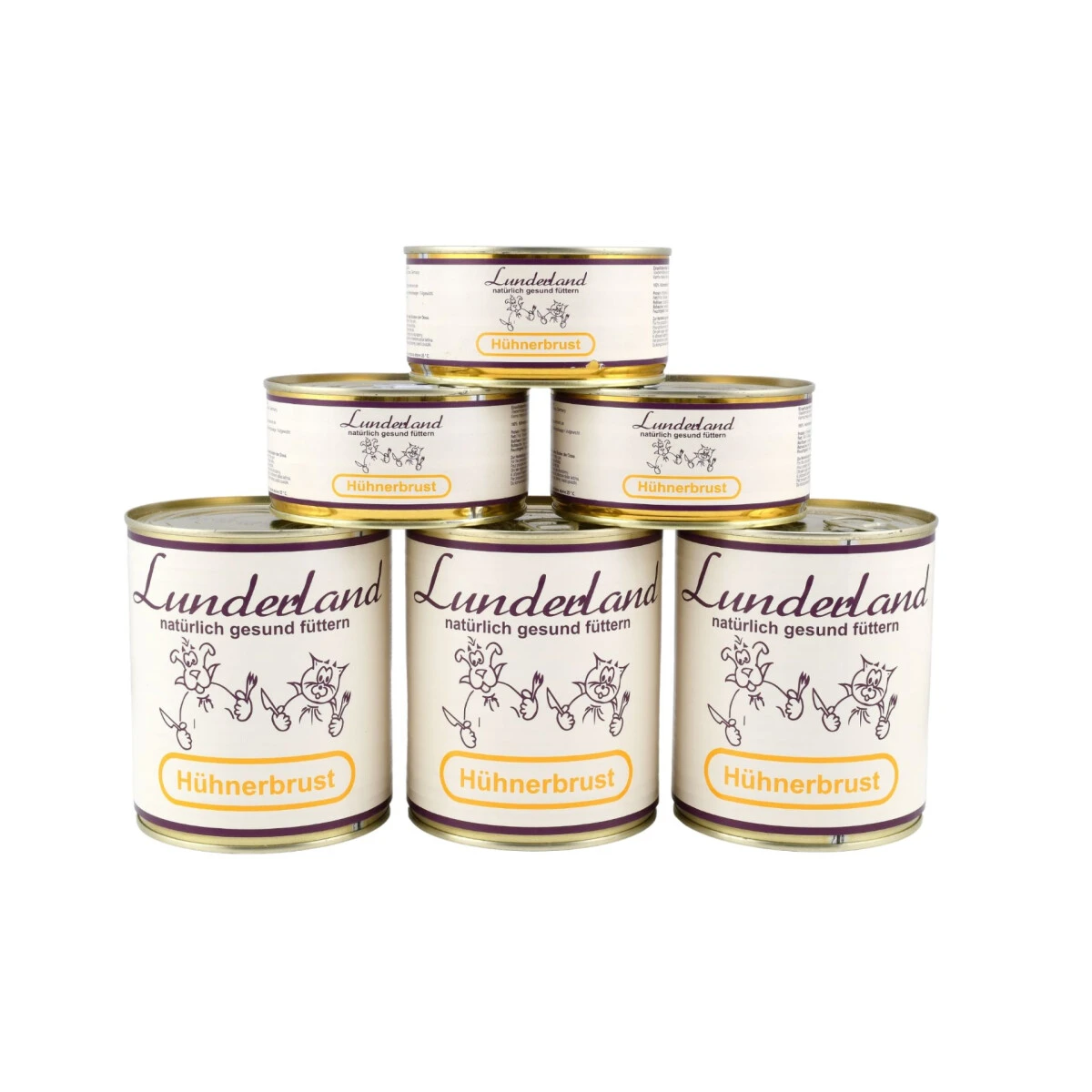 sind zu 100 % volldeklariert. Es werden neben den deklarierten Fleischteilen keinerlei Nebenerzeugnisse in die Dose gekocht. Protein- und Fettanteil in den Dosen entsprechen dem natürlichen Werten der Rohware. Es werden keine Fette und keine sonstigen Proteinquellen hinzugefügt. Der extrem niedrige Wert an Rohfaser und Rohasche weist nach, dass keine Füllstoffe verwendet wurden. Selbstverständlich sind die Dosen frei von Farb-, Aroma- bzw. Konservierungsstoffen und enthalten keine synthetischen Vitamine oder Mineralstoffe.